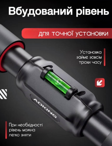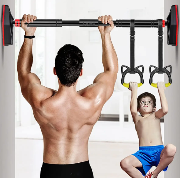 Це переносний регульований турнік без гвинтів для встановлення в дверний проріз, шириною від 130 до 157 см. Він чудово підходить як для дорослих, так і для дітей завдяки наявності в комплекті підвісної гойдалки та гімнастичних кілець. Турнік не вимагає свердління стін і легко встановлюється без інструментів — достатньо закріпити його в прорізі за допомогою вбудованого різьбового механізму.