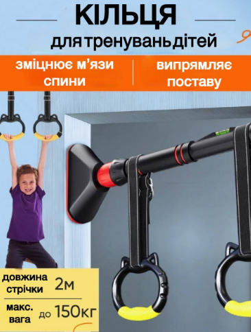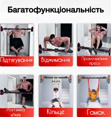 Для дорослих: підтягування, підйоми ніг, вправи на прес, зміцнення спини, грудей і рук. Для дітей: катання на гойдалці, ігри з кільцями — розвиток моторики, сили та координації. Можна використовувати щодня для фітнесу, розтяжки або просто активного відпочинку вдома.